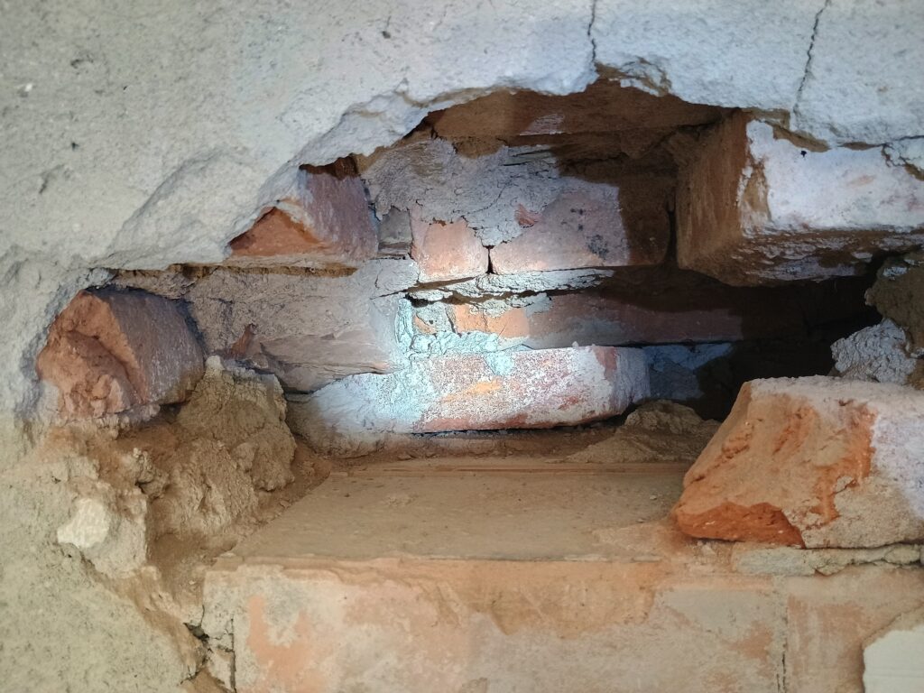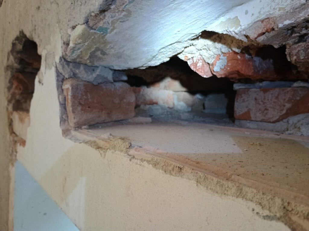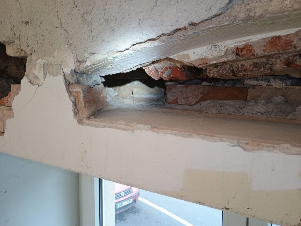 - Původní cihelný překlad "kulhá", kdysi mu amputovali levou nohu a pahýl přilepili lžicí malty. Rozuměj - ubourali kus zdi, do které se překlad opíral, teď se opírá jenom do jedné cihly a ždibíčku malty, proto je s podivem, že to ještě nespadlo ...