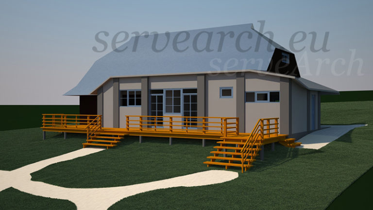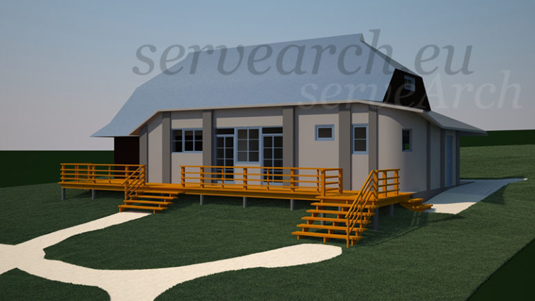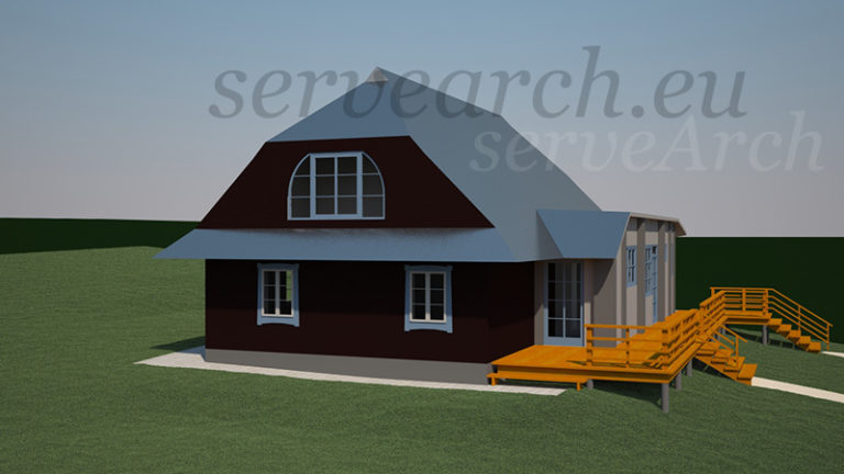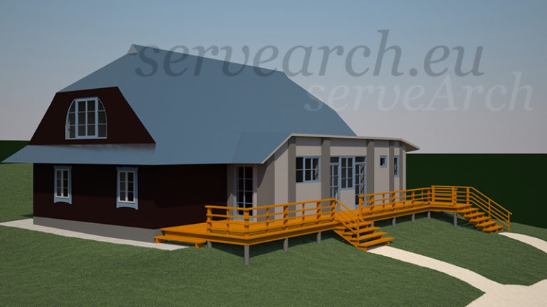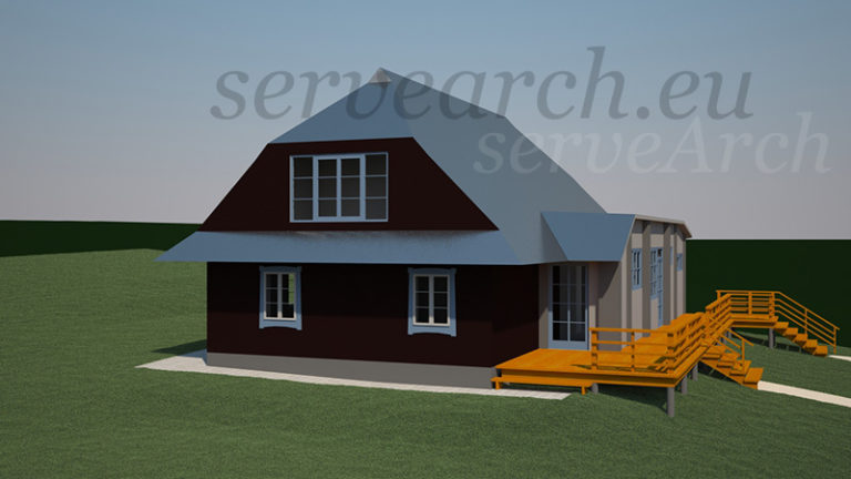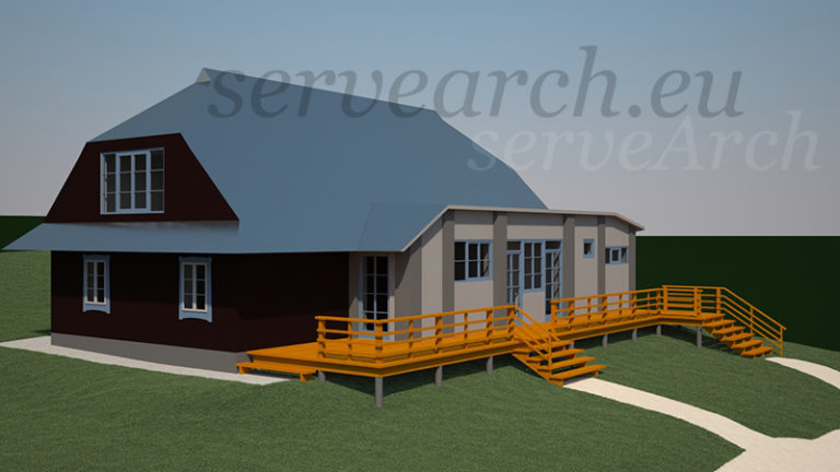 Další otevřenou návazností by měl být dřevěný ochoz/terasa podél celé přístavby, kam povedou otevíratelné dveře kuchyně. (Kuchyň jsme ponechali na jejím původním místě.) Takto vytvořené otevření do "toho něčeho vzadu" a vymezení/ohraničení "tohoto něčeho" ochozem, utváří soukromou zahradu za domem se vším, co by k tomu mohlo náležet včetně sauny v blízkém tůjovém hájku; zároveň dává tušit úžasnou venkovskou idylu: