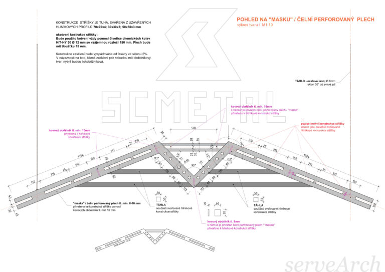 "Chtěl bych stříšku na pokraji kýče", řekl pan Eigel, když viděl na prvním setkání moje jednoduché tvary. Nedokážu úplně posoudit, jestli jsem nakonec vyhověla ... Pánové z SCMetalu byli nadšení, oni prý ostrý lokty maj, jak hrany těch jejich plechů, co prodávaj - pan Eigel, výkonný ředitel; pan Janáček, pravá ruka pana Eigla; a pan Smejkal, strojní inženýr. ... Takhle detailní výkresy prvku jsem nikdy nedělala, člověk se furt učí. ;-)