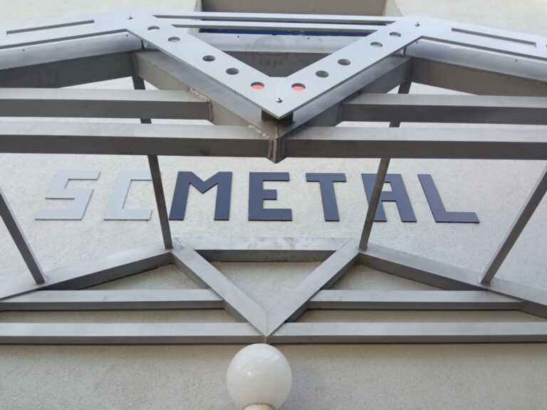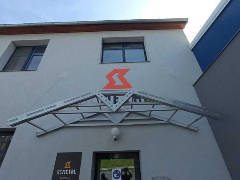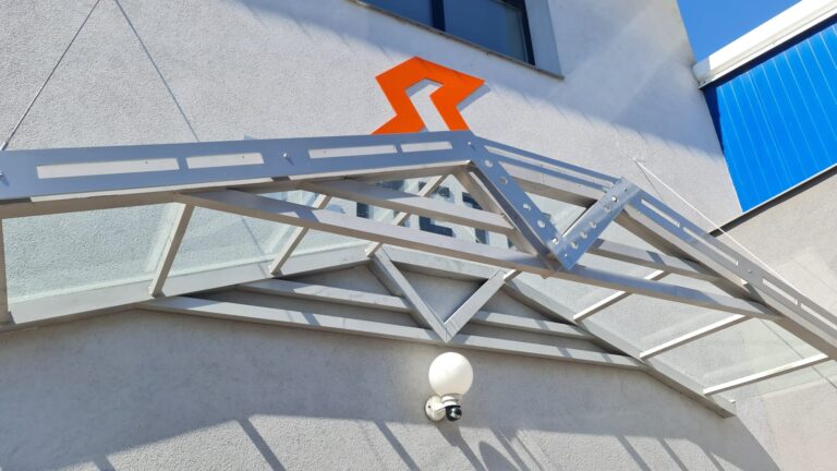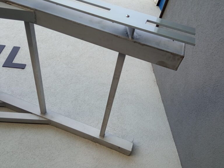 Kostra je svařená z uzavřených hliníkových profilů a vynesena ocelovými táhly, licencovanými samozřejmě, kotvenými do fasády nad stříškou. Hliník je lehký. Povrch profilů jsme nechali upravit pískováním ... zblízka je drobně blyštivý, metalízový a přijímá barvu okolního světa. 😊 ... Nějakou dobu jsme hledali způsob, jak povrch zafixovat, uzavřít, před větrem, deštěm, sněhem, sluncem ... i vzhledem k rozpětí konstrukce se pískování nakonec ukázalo jako jediné řešení.