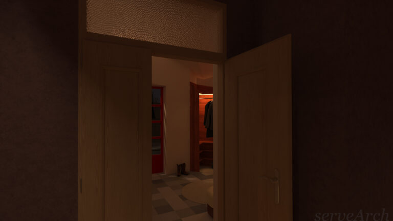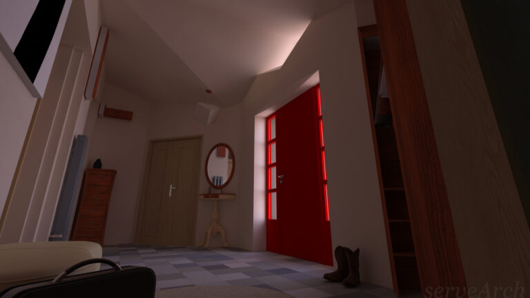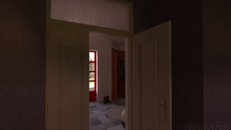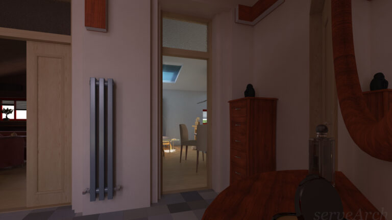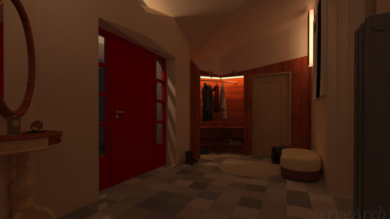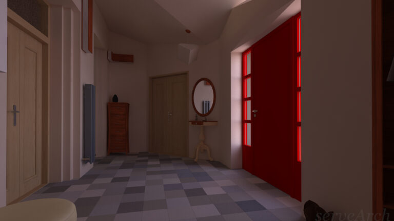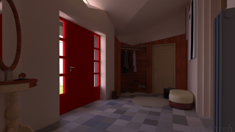 Naše hala může působit lehce komisně, chcete-li přísně, tak trochu "přivítání v odměřeném" (přece jen je to místo-rozhraní mezi vnějškem a vnitřkem). V hale je dosti tvarovaný strop a je to o to veselejší (i když možná jak pro koho), že je předem nemíněným důsledkem konstrukce střechy nad ní, že by "konstruktivismus"? Nebože by "forma sledovala funkci"? Asi. Na "funkcionalismus" to moc nevypadá. Možná by si zasloužil i nějak pěkně vymalovat, jako každý správný strop ještě před sto lety, zdůraznit jeho hrany a "prolákliny", kdyby se mu zachtělo pseudo-tradicionalistické zpěvohry. Proti gustu žádný dišputát. :) Ale bylo by to příliš časově náročným, už tak věnujeme tomuto domu nebývalou péči i přesto, že náš bývalý klient by naši práci nejspíš neocenil, a to v pravém významu tohoto slova.